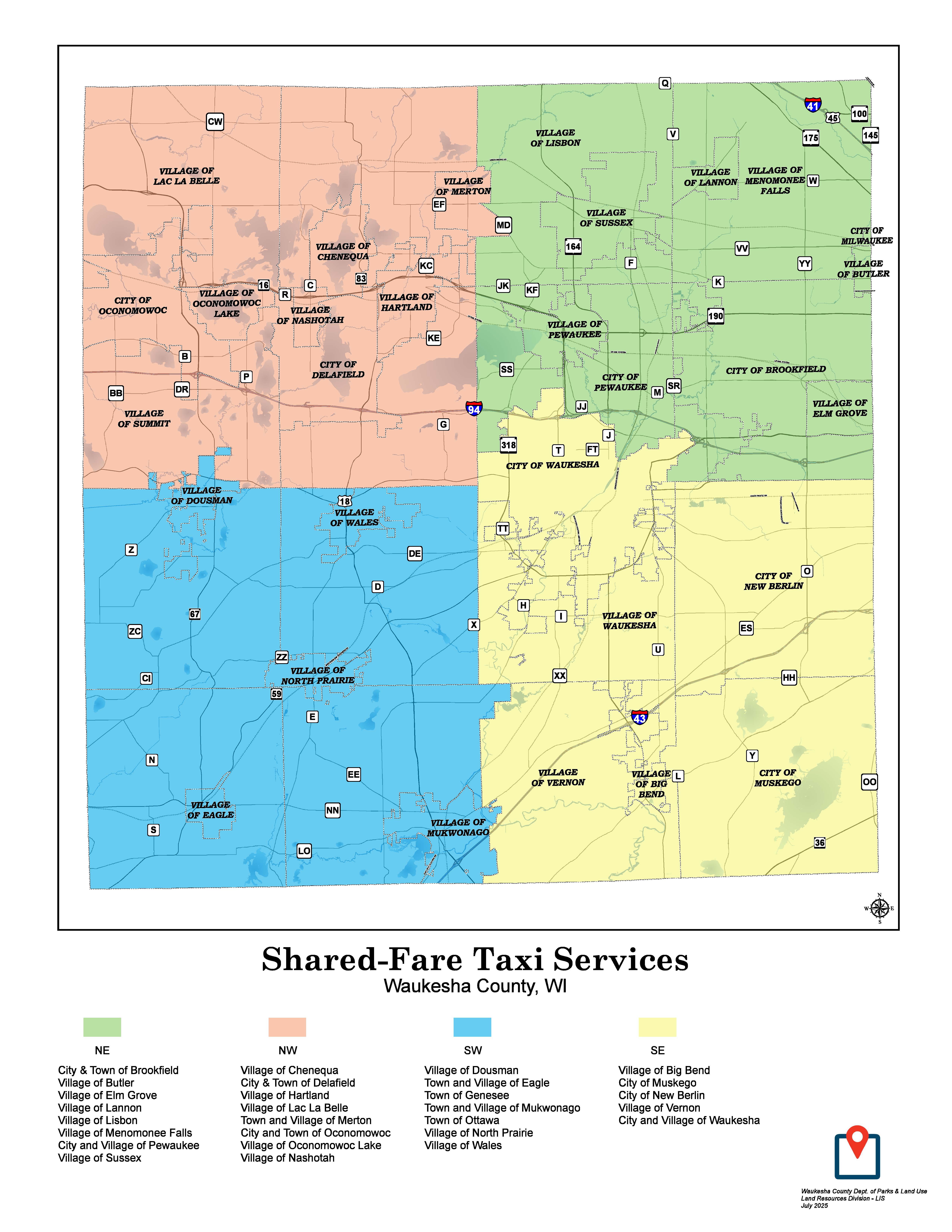 Service provided for trips within Waukesha County. Out of County trips must be pre-approved and may be available to parts of Milwaukee County for medical services only if service is not duplicated in Waukesha County.