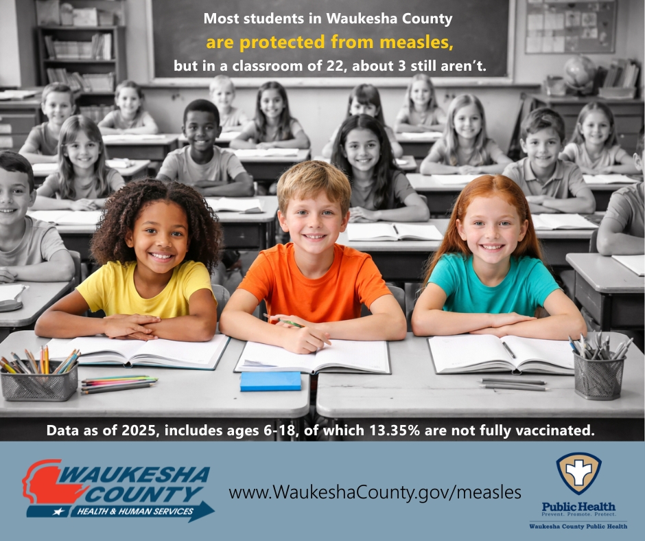 According to DHS and the Centers for Disease Control and Prevention (CDC), measles is preventable through vaccination. Children should receive two doses of MMR vaccine, and adults without evidence of immunity should ensure they are up to date. Vaccinations are available through healthcare providers, select pharmacies, and local health clinics. Waukesha County Public Health will continue monitoring measles activity statewide and nationally and will provide updates if needed.